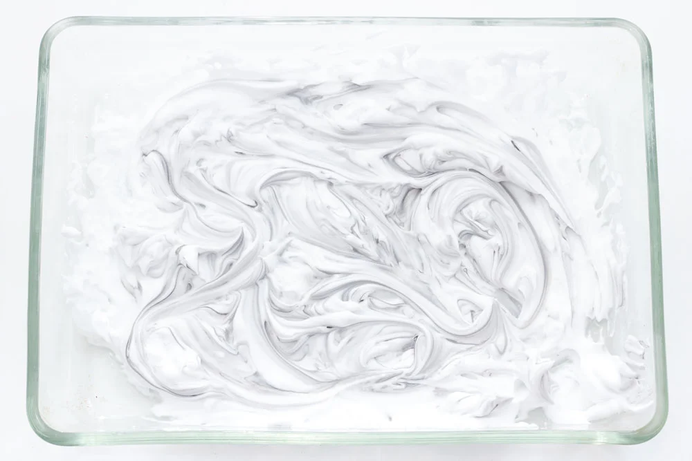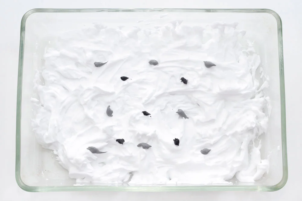 Squirt the shaving foam or gel into the tray (you will need quite a lot!) If you are using shaving gel, you will have to froth it up by moving it around with your fingers really quickly - this should make it nice and foamy. Then, add small dots of black and grey paint on top of the shaving foam in random places. If you want a coloured marble effect then use different coloured paints.