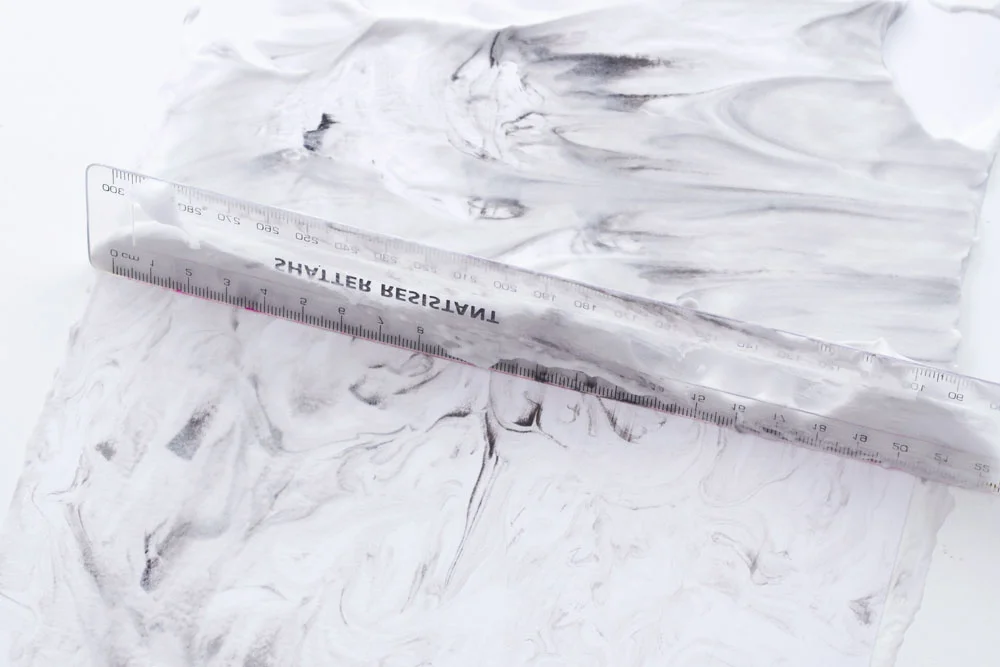 Place a piece of thick white paper on top of the marbled shaving foam in the tray and gently push down to ensure the foam covers the whole surface of the paper. Remove the paper from the tray and use the ruler or scraping stick to scrape off all of the excess shaving foam. This should leave a marbled effect from the paint on the paper!